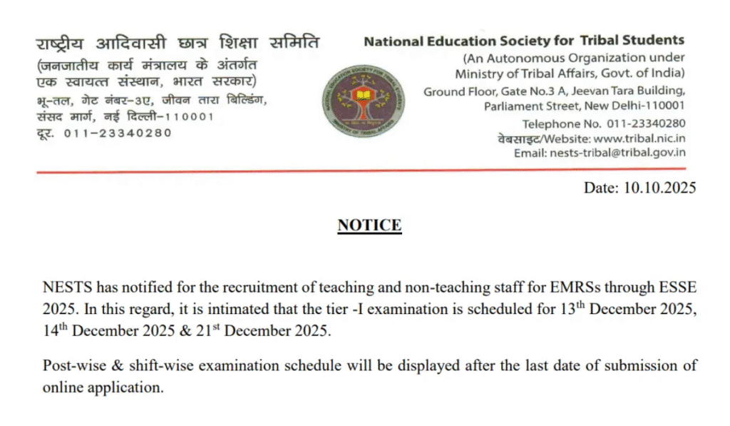 The EMRS exam for 2025 is scheduled on December 13, 14, and 21, 2025. This exam is for both teaching and non-teaching positions and should be conducted by the National Education Society for Tribal Students (NESTS) on the behalf of Ministry of Tribal Affairs.