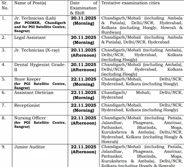 The PGIMER Computer-Based Test (CBT) for Group B & C posts is scheduled on November 20 and November 22, 2025. It will be conducted in multiple shifts across several Indian cities including Chandigarh, Delhi/NCR, Hyderabad, and Kolkata.