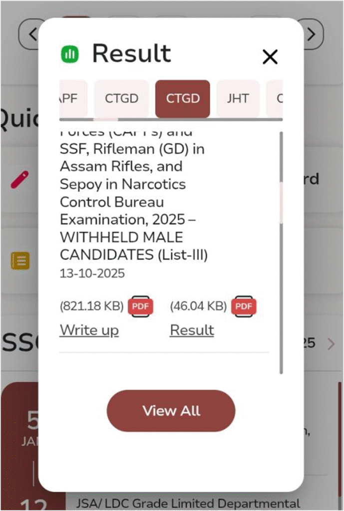 • Under the quick link section you will see the SSC GD Constable Result 2025 link and after that will see all the examinations conducted by the board in your screen. You need to find out the CTGD section where all three lists are uploaded by the authority.
